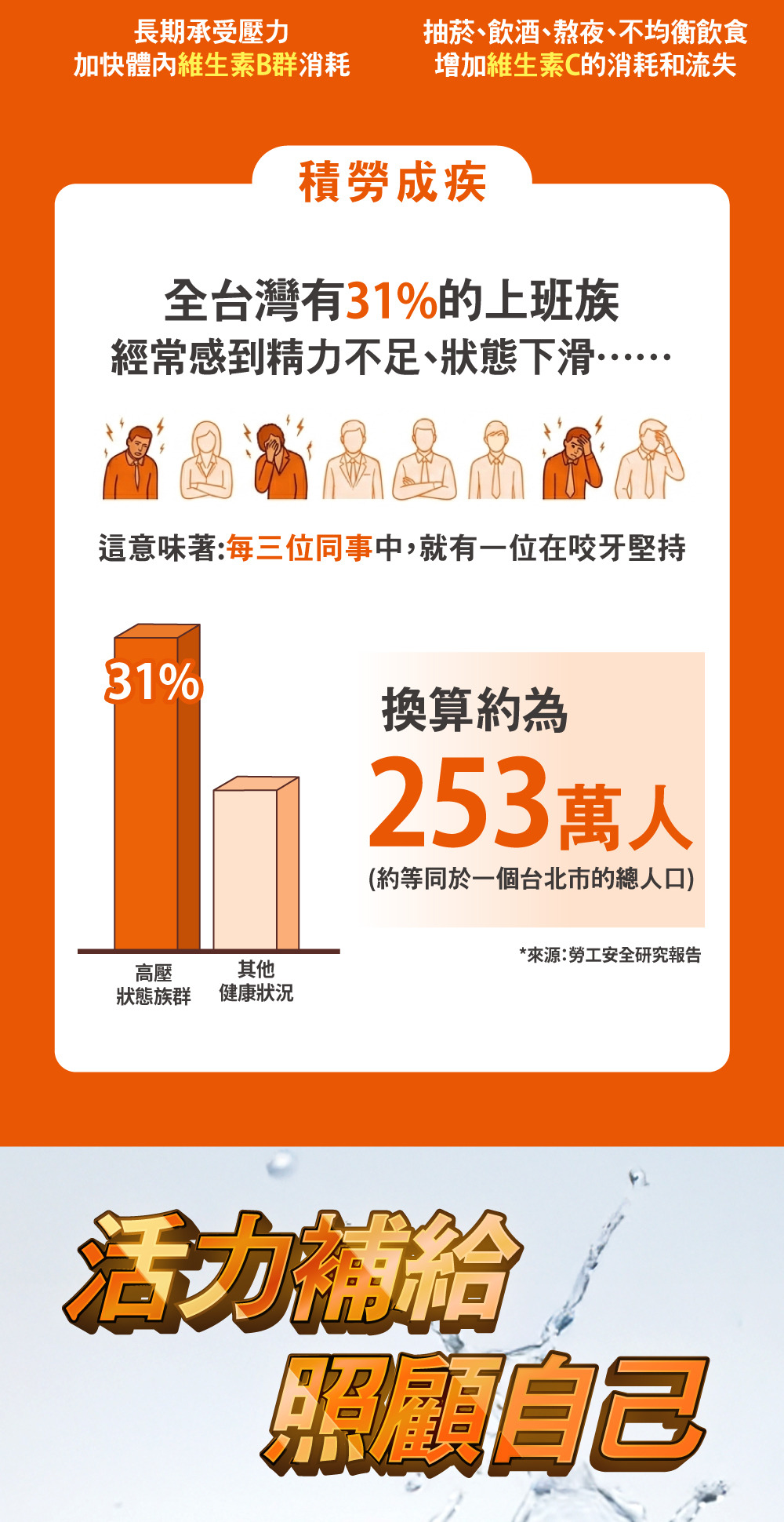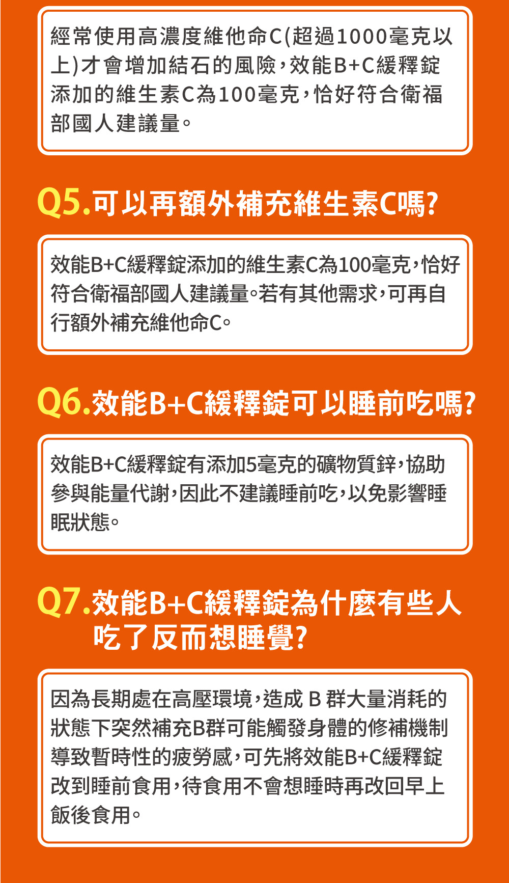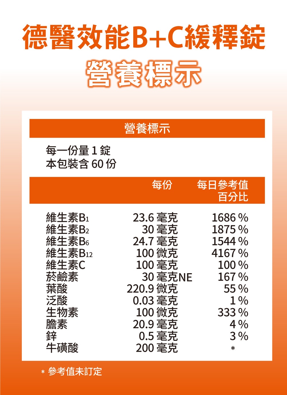 成分:牛磺酸、L-抗壞血酸(維生素C)、麥芽糊精、微結晶狀α-纖維素、重酒石酸膽鹼(重酒石酸膽鹼、二氧化矽)、鹽酸硫胺明(維生素B1)、核黃素(維生素B2)、鹽酸吡哆辛(維生素B6)、菸鹼醯胺、馬鈴薯澱粉、硬脂酸鎂、複方酵母粉(含鋅)(非活性酵母、硫酸鋅)、葉酸、生物素、氰鈷胺明(維生素B12)、本多酸鈣